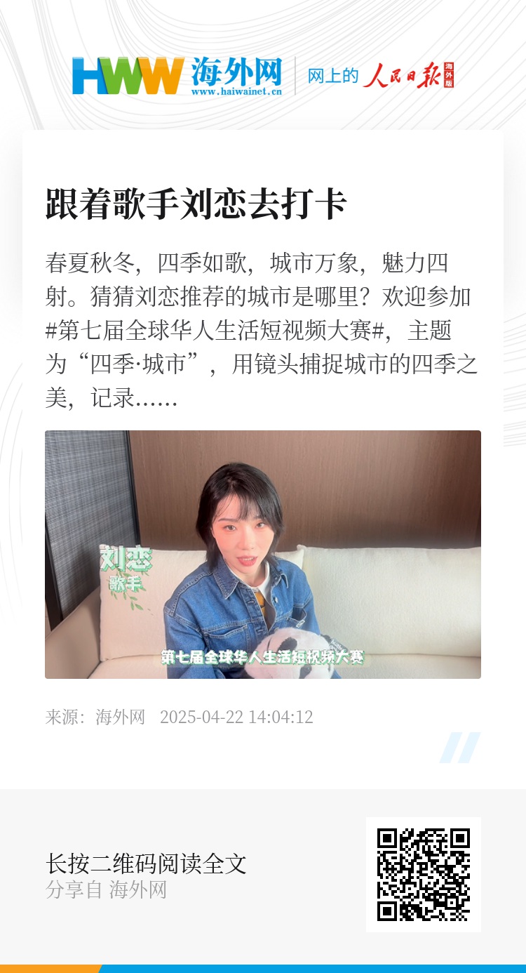 春夏秋冬,四季如歌,城市万象,魅力四射。猜猜刘恋推荐的城市是哪里?欢迎参加#第七届全球华人生活短视频大赛#,主题为“四季·城市”,用镜头捕捉城市的四季之美,记录这片土地的多元魅力与生命力。下载人民日报海外版客户端,上传你的作品吧!#明星推荐官#