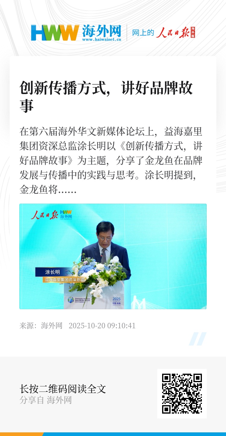 在第六届海外华文新媒体论坛上,益海嘉里集团资深总监涂长明以《创新传播方式,讲好品牌故事》为主题,分享了金龙鱼在品牌发展与传播中的实践与思考。涂长明提到,金龙鱼将继续深耕农产品加工产业,以优质产品守护国民餐桌,讲好中国品牌走向世界的故事。#第六届海外华文新媒体论坛#