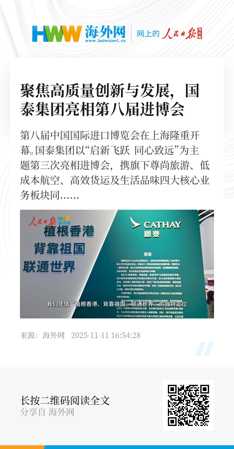 第八届中国国际进口博览会在上海隆重开幕。国泰集团以“启新飞跃 同心致远”为主题第三次亮相进博会,携旗下尊尚旅游、低成本航空、高效货运及生活品味四大核心业务板块同台呈现。国泰将继续秉持长远发展视野,在拓展航线网络、创新产品和服务、推进可持续发展等领域稳步推进,积极融入国家高水平对外开放大局,为促进中国与世界的互联互通、人文交流与经贸合作持续贡献积极力量。