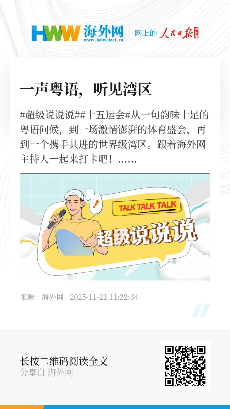 #超级说说说##十五运会#从一句韵味十足的粤语问候,到一场激情澎湃的体育盛会,再到一个携手共进的世界级湾区。跟着海外网主持人一起来打卡吧!