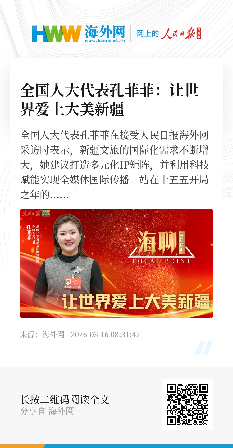 全国人大代表孔菲菲在接受人民日报海外网采访时表示,新疆文旅的国际化需求不断增大,她建议打造多元化IP矩阵,并利用科技赋能实现全媒体国际传播。站在十五五开局之年的新起点上,孔菲菲表示,希望未来五年,新疆能够成为人们心目中的世界级旅游目的地、心灵疗愈之地和丝路文明的“活态博物馆”。