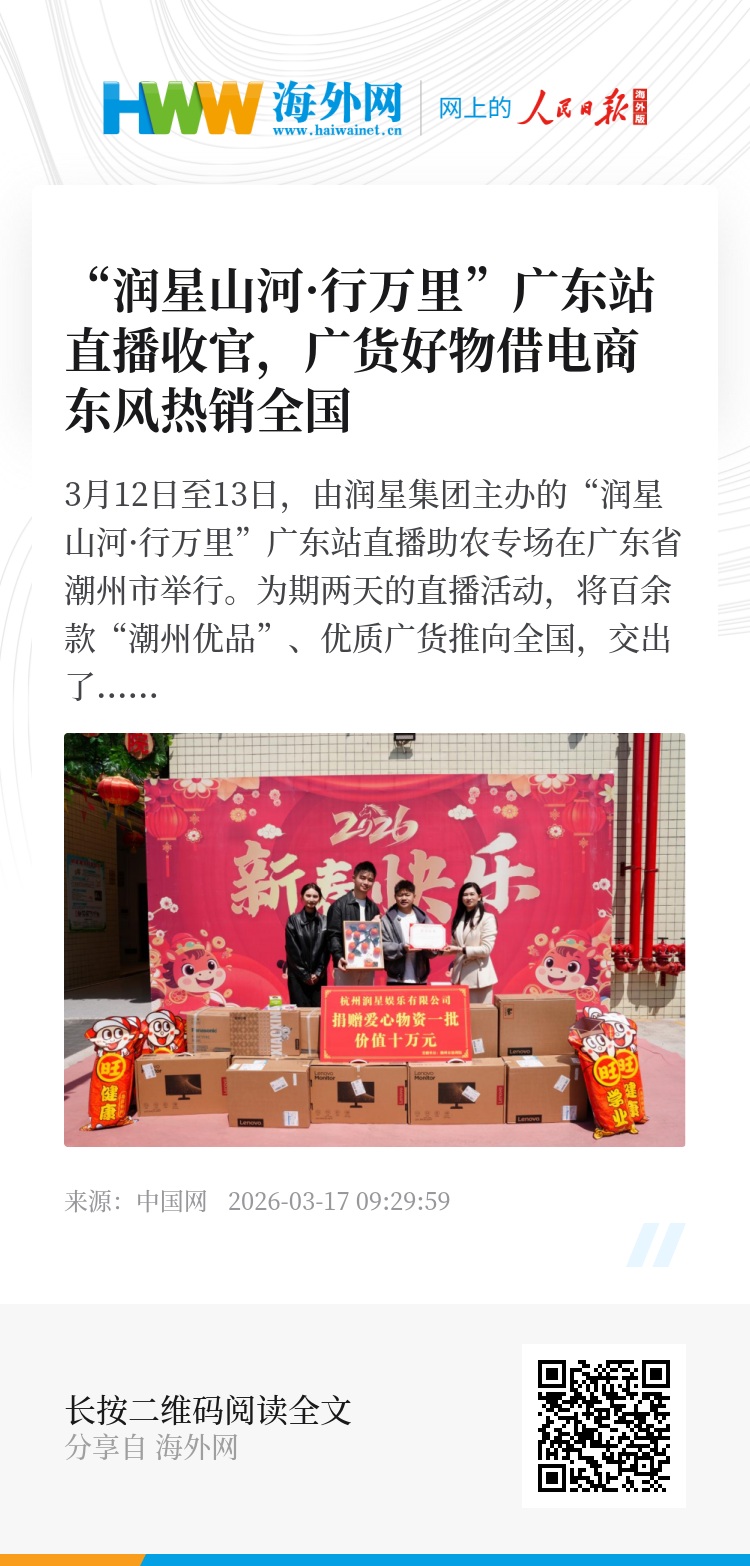 3月12日至13日,由润星集团主办的“润星山河·行万里”广东站直播助农专场在广东省潮州市举行。为期两天的直播活动,将百余款“潮州优品”、优质广货推向全国,交出了亮眼的销售答卷,更印证了直播电商赋能乡村振兴、带动全域消费的无限可能。