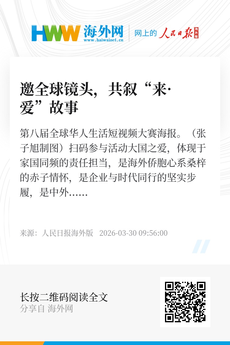 日前,以“来·爱”为主题的第八届全球华人生活短视频大赛作品征集正式启动,通过镜头记录时代温度,以影像传递人间真情。